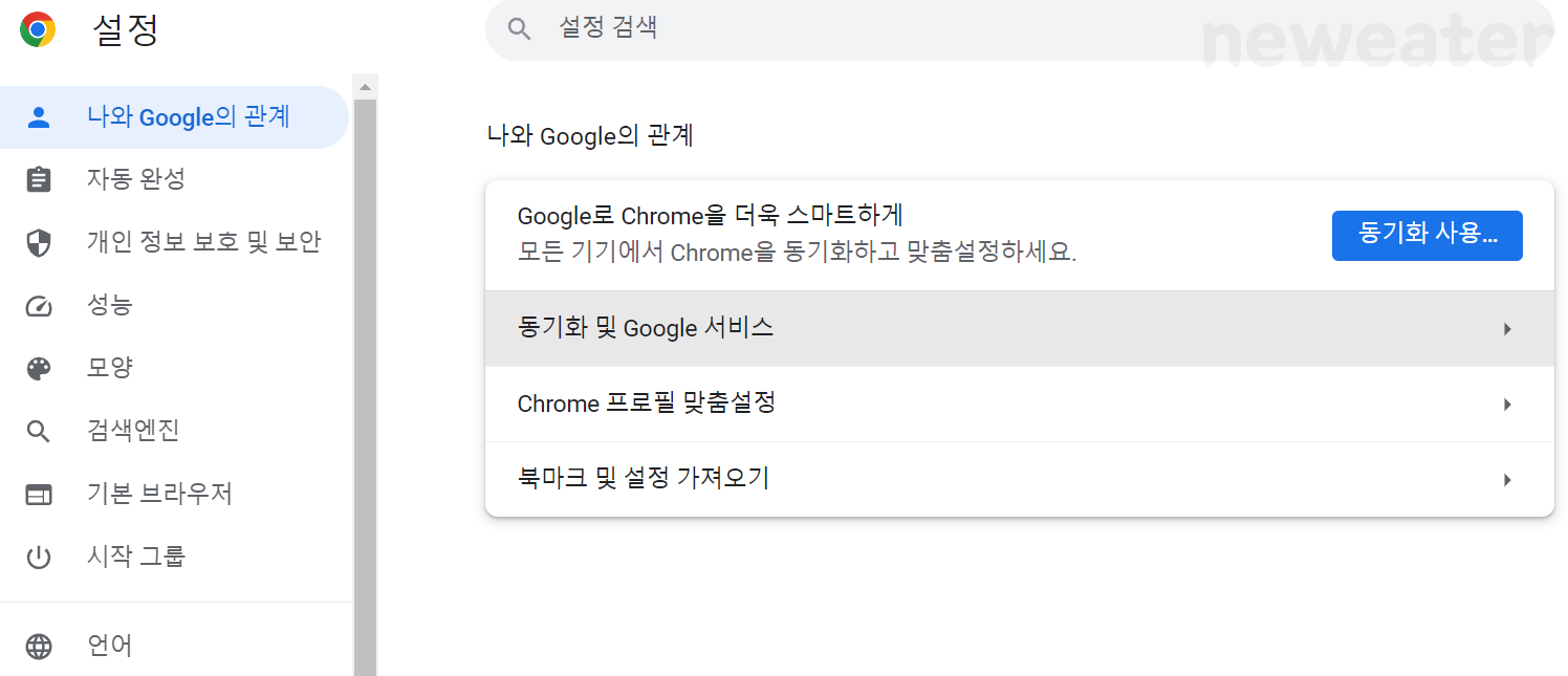 끄기 위해 크롬 설정에서 맨 위에 있는 나와 Google의 관계에서 동기화 및 Google 서비스로 이동한다.